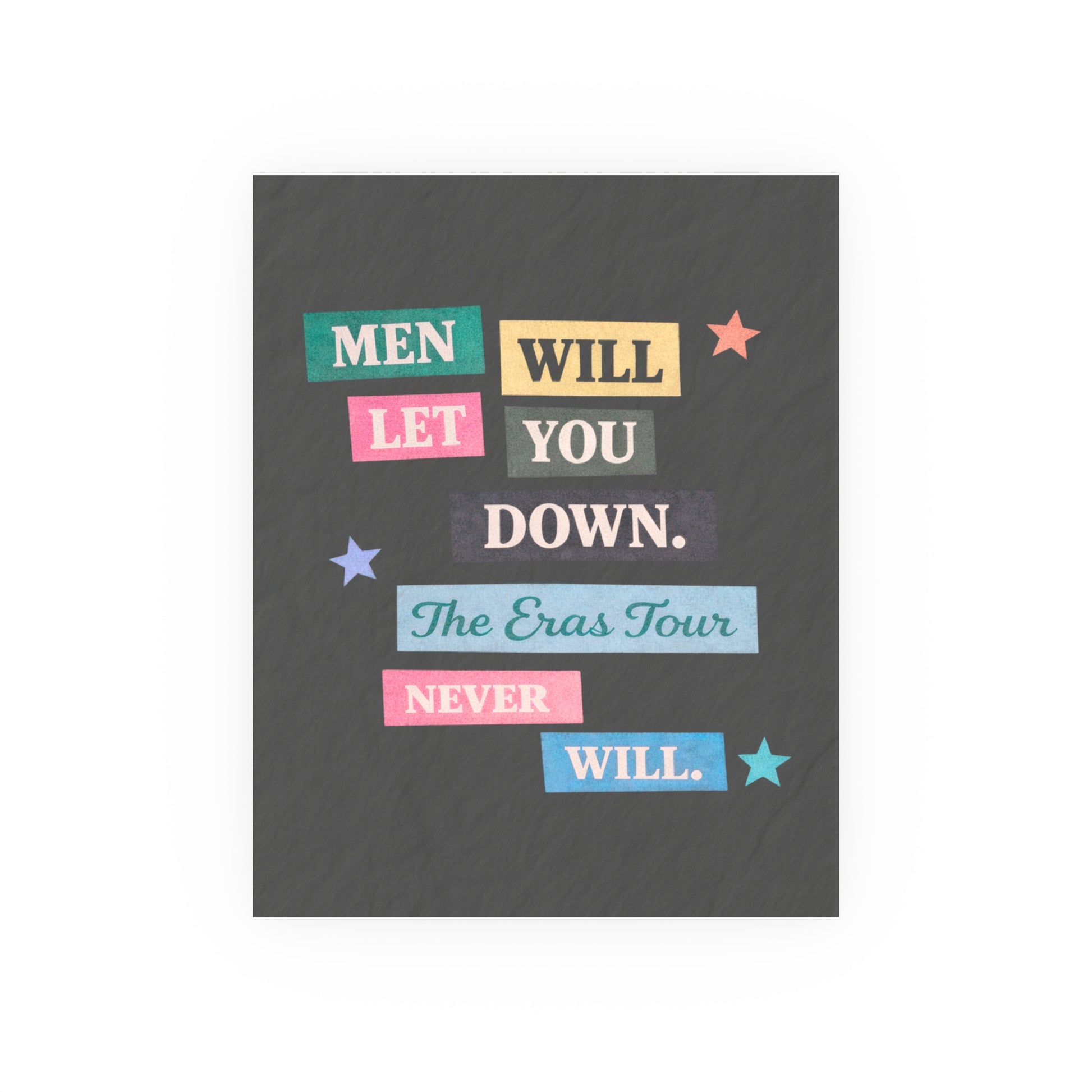 This physical art print is a playful, nostalgic collage inspired by concert nights, pop eras, and the memories that outlast everything else. Designed with layered, vintage-style paper textures and Eras-coded color accents, it’s made to feel collected — not mass-produced.
